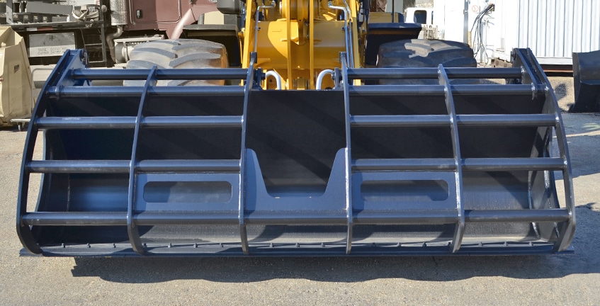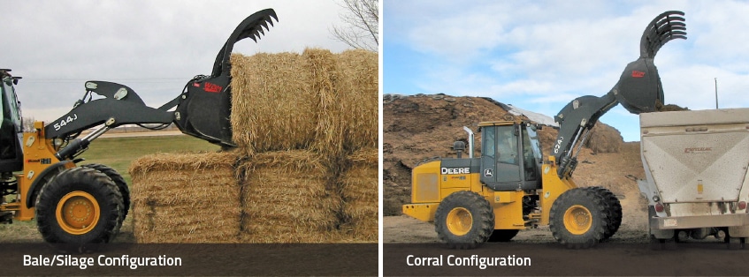 These buckets are available in either Bale/Silage or Corral bucket configurations. Bale/Silage buckets differ by having a larger, concave (smaller) radius on the leading edge, and the basket is taller to allow for better round bale handling than the Corral bucket, creating approximately ¼ yd. increase in capacity over the Corral bucket. The tips on their overarm are also designed with extended length to increase penetration and hook into bales, increasing capacity in silage loading applications.