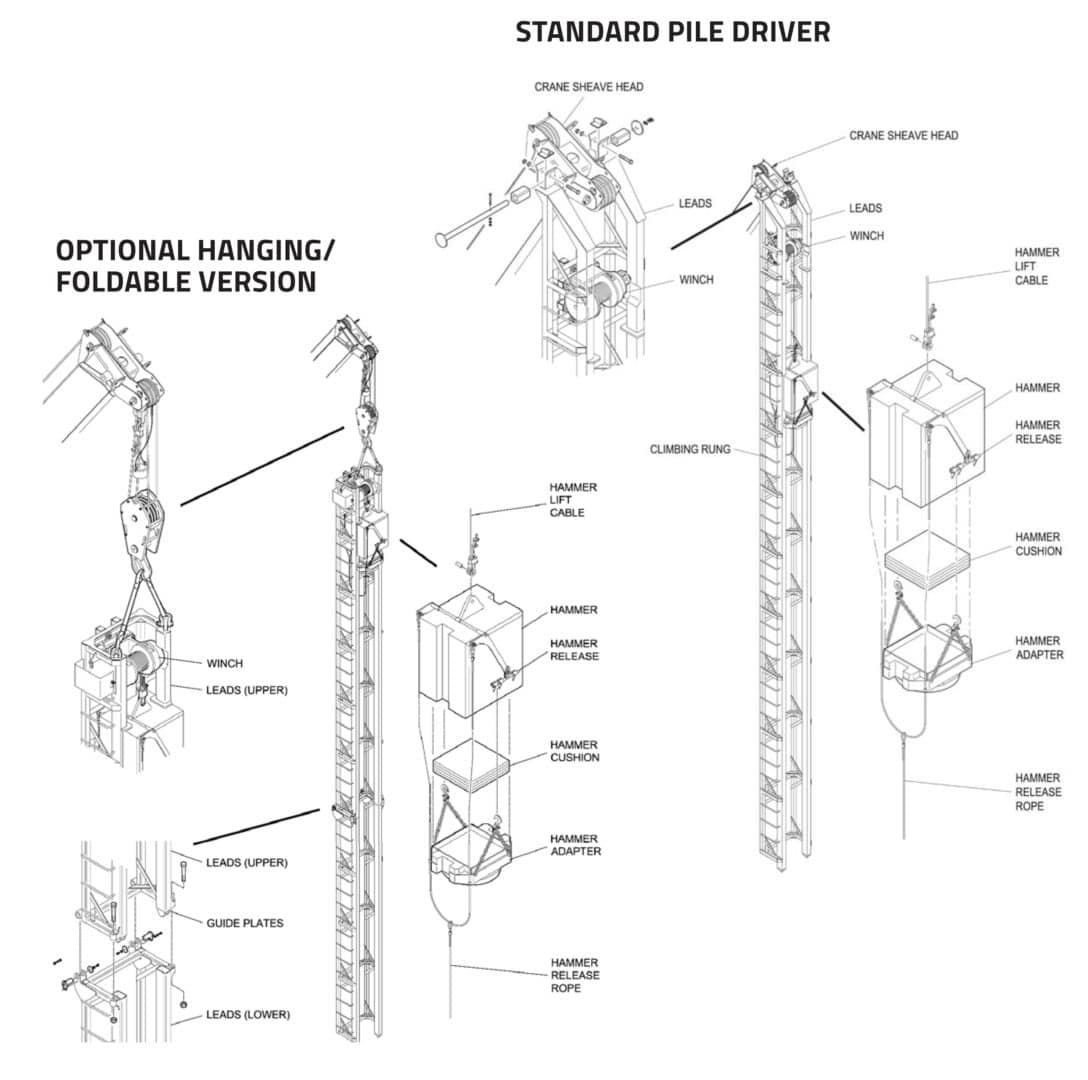 - 55.5’ leads easily accept 40’ lengths of standard piling material