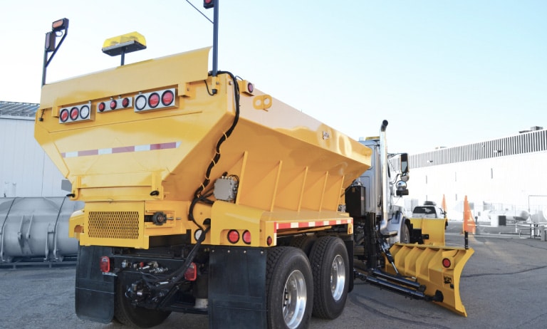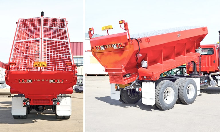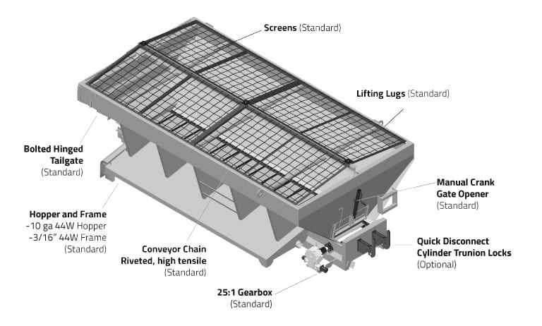 WBM Sander Boxes are built with 10 gauge Corten corrosion resistant steel, while the mainframe is built from 3/16″ corten steel. It is structurally designed to withstand the weight of a full box of material when dumping. When accompanied with the hoist cylinder (optional), material can be dumped out the rear of the box through the manually bolted rear tailgate. Also included are a manual crank discharge gate opener, 24″ discharge chute, rear pivot blocks, hopper lifting lugs and a 25:1 gearbox for the conveyor chain operation.