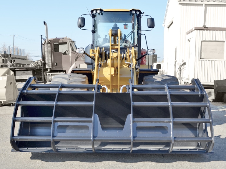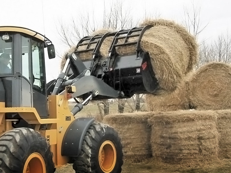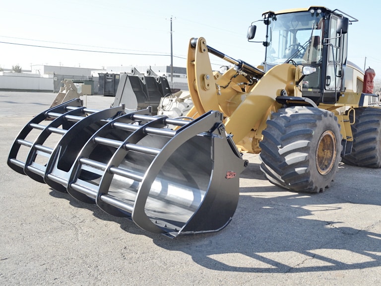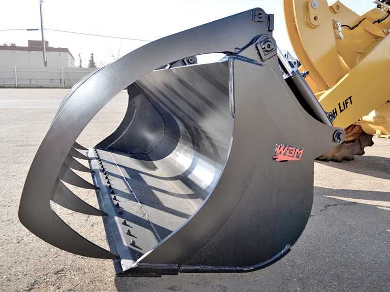 Products /WBM Bale/Silage Buckets are designed specifically for handling round bales and loading silage in an agricultural feedlot application. Compared to a Corral Bucket, the Bale/Silage Bucket has a larger convex radius on the leading edge and the basket is taller to allow for better round bale handling. This creates approx. 1/4 yd increase in capacity over the Corral Bucket. The tips on the overarm are typically designed with extended length to increase penetration into the round bales and increase capacity in silage loading applications.