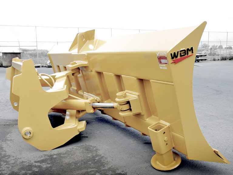 Products / Wheel Loader Attachments / Wheel Loader Blades/Plows / WL Hydraulic Angle BladeWBM Wheel Loader Hydraulic Angle Blades are the ultimate attachment for wheel loader dozing, grading and general clearing applications. With 30º of left or right blade angling, the operator has increased material control during dozing operations, right from the cab. In the straight blade position, the wheel loader linkage enables the operator to pitch the blade forward or back to alter the grading or cutting ability of the blade.