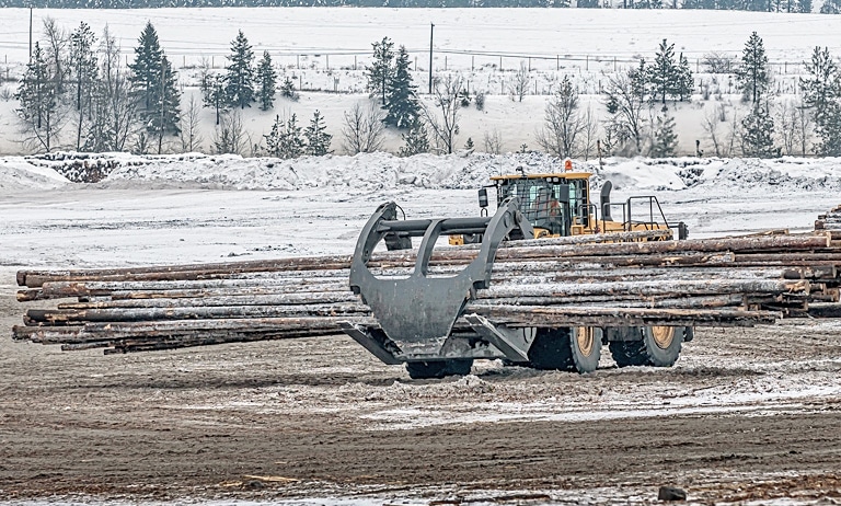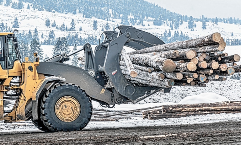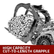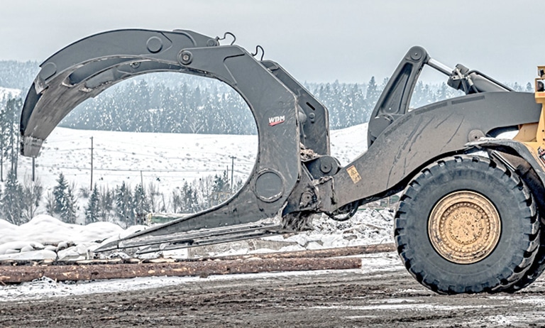 Products / Wheel Loader Attachments / Wheel Loader Grapples / WL Tree Length Log GrappleWBM Wheel Loader Tree Length Log Grapples have been recognized as the staple in unloading and loading tree length wood. By using heavy-duty welded box construction in the shoe weldments and overarm, the grapple is capable of maximizing payload while maintaining excellent load stabilization in rough or uneven terrain. Versatility is achieved through the ability to handle large loads or to sort wood one log at a time.
