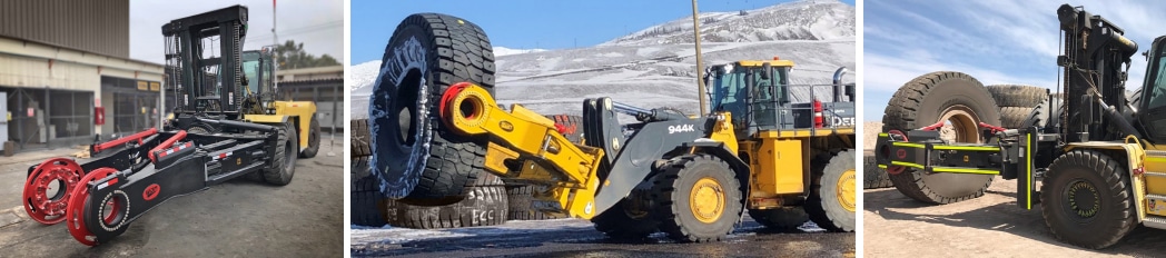 WBM Tire Manipulators (Handlers) is designed to safely and efficiently handle OTR tires and rim assemblies on large mobile equipment. Models are available for forklift trucks, telehandlers, or wheel loaders.
